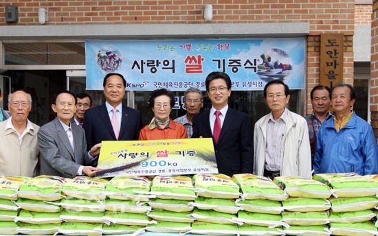 대전광역시 유성구(구청장 허태정)가 도안휴먼시아1단지 경로당에서 26일 국민체육진흥공단 경륜․경정사업본부 유성지점(지점장 정찬구)으로부터 관내 임대아파트 경로당을 8개소를 돕기 위한 200만원 상당의 백미 900㎏을 지정 기탁받았다.