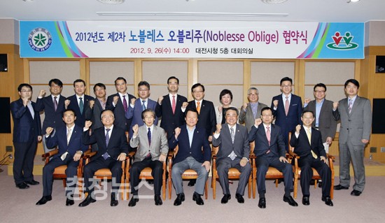 대전시는 26일 오후 2시 시청 대회의실에서 염홍철 시장, 남재동대전시자원봉사연합회장, 이인학 대전시자원봉사센터장, 18개 기관‧기업 대표들이 참석한 가운데‘노블레스 오블리주(Noblesse Oblige)’협약식을 가졌다.