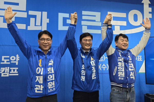 (왼쪽부터)이재관·이정문·문진석 후보가 총선 승리를 다짐하고 있다/사진=박동혁 기자