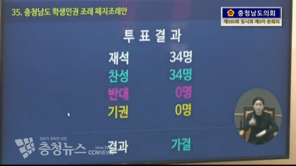 충남 학생인권 조례 폐지 조례안 투표 결과/사진 권상재 기자