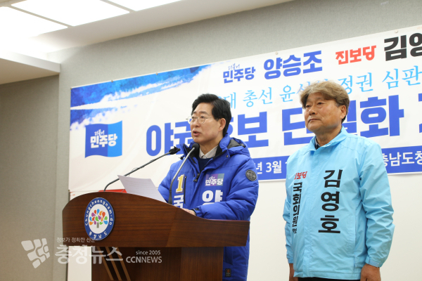[충청뉴스 권상재 기자] 충남 홍성·예산 국회의원 야권 단일화에 성공한 양승조 더불어민주당 국회의원 후보가 19일 김영호 진보당 예비후보와 맞손을 잡고 4·10 총선 승리를 다짐했다.