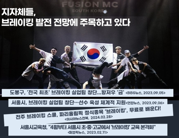 아울러 “우리나라는 자타공인 브레이킹 세계 최강국으로 각종 세계대회를 석권하고 있으며 항저우에서는 은메달을 획득하기도 했다. 파리올림픽에서도 좋은 성적을 거둘 것”이라고 전했다.