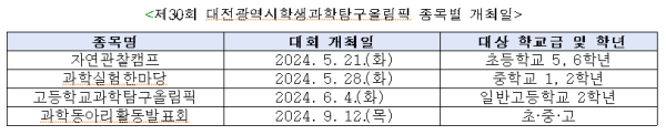 올해로 30번째를 맞이하는 대전광역시학생과학올림픽은 교육부가 주최하고 한국과학창의재단과 한국과학교육총연합회가 주관하여 매년 개최되는 전국대회 참가를 위한 대전광역시교육청대회로써 ▲자연관찰캠프 ▲과학실험한마당 ▲고등학교과학탐구올림픽 ▲과학동아리활동발표회 등 4개 종목이 종목별 대회 일정에 따라 대전교육과학연구원에서 개최될 예정이다.
