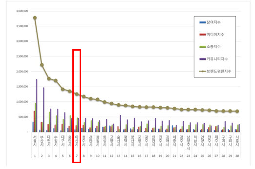 이번 조사는 한국기업평판연구소가 지난달 25일부터 지난 25일까지 우리나라 도시브랜드 빅데이터 5,865만 9,081개를 분석해 소비자들의 브랜드 평판을 분석한 결과다. 1~3위는 광역시인 서울, 부산, 대전시가 각각 차지했다.