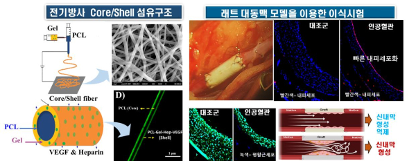 연구팀은 core를 PCL로 선택하고, 상대적으로 생분해가 빠른 Gel을 shell로 구성해 core/shell 구조의 나노섬유를 제조했다. 특히 shell에는 헤파린과 VEGF를 탑재했으며, 이를 통해 항혈전과 내피세포 활착 및 증식을 촉진해 장기 개존율을 높일 수 있도록 설계했다.