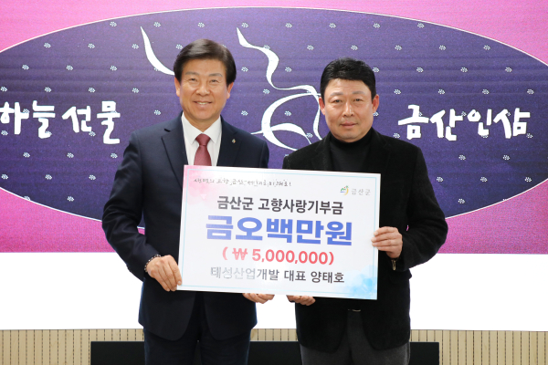 [충청뉴스 금산 = 조홍기 기자] ㈜태성개발 양태호 대표는 지난 26일 고향사랑기부제 최고한도액 500만 원을 금산군에 기부했다.