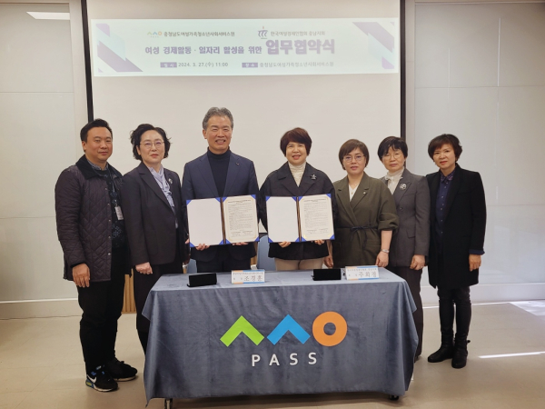 [충청뉴스 권상재 기자] 충남여성가족청소년사회서비스원(이하 서비스원)은 27일 한국여성경제인협회 충남지회와 업무협약을 체결하고 여성의 경제활동 활성화 및 양성평등 문화 확산을 위한 포괄적 상호협력 관계를 구축했다고 밝혔다.