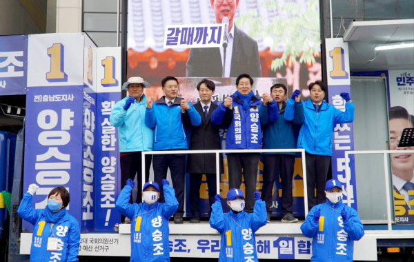 한편, 이날 유세장 곳곳에는 더불어민주당 수많은 지지자들이 양승조 후보와 이탄희 의원을 외치는 환호 속에 분위기를 한껏 고조시켰다.