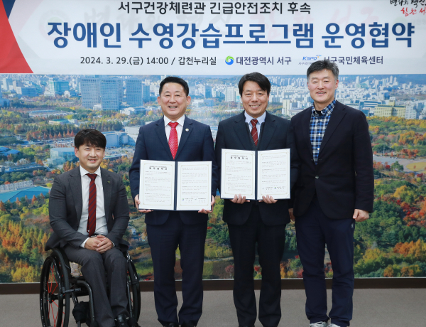 [충청뉴스 박영환 기자] 대전 서구(구청장 서철모)는 29일 서구국민체육센터(대표 김대일)와 ‘장애인 수영강습프로그램 운영’ 업무 협약식을 개최했다고 전했다.