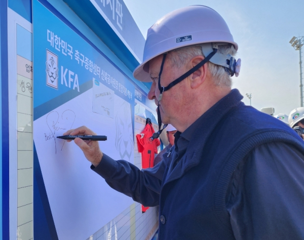 히딩크 전 감독과 정몽규 회장, 박상돈 시장은 공사 안전기원 서명식에 이어 현 축구 국가대표 주장 손흥민 선수의 유니폼에 사인 후 메인 스타디움, 숙소동, 훈련장 부지 등을 둘러봤다.