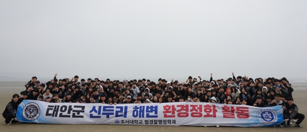 이번 봉사활동은 법경찰행정학과의 전통적인 MT 프로그램이다. 재학생과 교수 200여 명은 지난달 29일 충남 태안군 신두리 인근 해안 일대로 MT를 떠나 주변 쓰레기를 수거하는 등 환경정화에 나섰다.