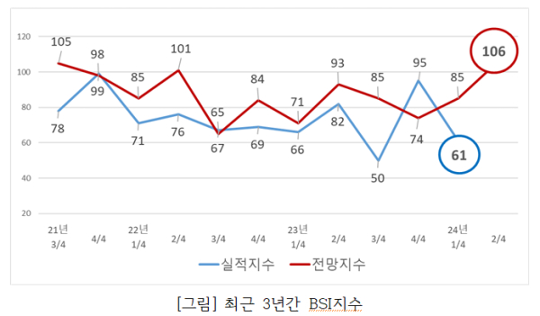 한편, 기업경기전망지수(BSI)는 기업들의 현장체감경기를 수치화한 것으로 0~200 사이로 표시되며, 100 이상이면 해당 분기의 경기를 이전 분기보다 긍정적으로 본 기업이 많다는 의미이고, 100 미만이면 그 반대다.