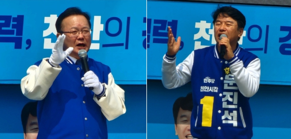 김부겸 더불어민주당 상임공동선대위원장(오른쪽)이 4일 충남 천안을 찾아 문진석 천안갑 국회의원 후보 지지를 호소했다/사진=박동혁 기자