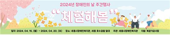 [충청뉴스 최형순 기자] 세종시장애인복지관(관장 윤용식)은 오는 15 ~ 20일까지 6일간 세종시장애인복지관 본관(세종특별자치시 조치원읍 평안로11) 및 세종호수공원 일대에서 제44회 장애인의 날을 기념한 주간행사 문화 체험 ‘체험해봄’을 개최한다.