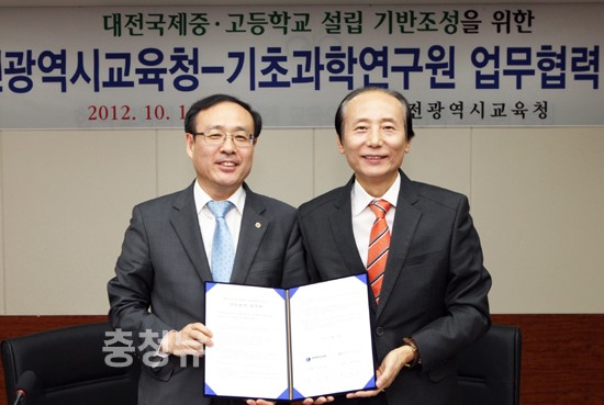 대전광역시교육청(교육감 김신호)은 기초과학연구원(원장 오세정·IBS)과 16일 오전 대전광역시교육청에서 대전국제중·고등학교 설립 기반 조성을 위한 교육협약을 체결했다.