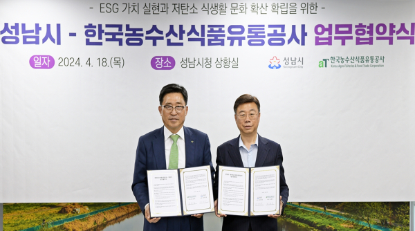 [충청뉴스 최형순 기자] 한국농수산식품유통공사(사장 김춘진)와 성남시(시장 신상진)는 18일 성남시청에서 ESG 가치 실천과 저탄소 식생활 확산을 위한 업무협약을 체결했다.