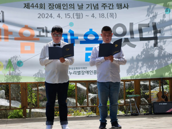 기념행사는 장애인당사자(이용인)가 직접 낭독하는 장애인헌장을 시작으로 장애인의 날 축하 문화공연인 시낭송, 누리별 장기 자랑, 사진 공모 및 시상식 순으로 진행됐다.