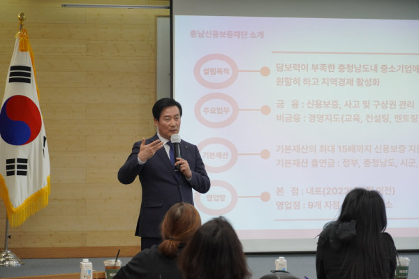 이날 마케팅 전략을 주제로 강연에 나선 충남신보 김두중 이사장은 충남신용보증재단 설립 목적과 중·소기업, 소상공인 금융‧비금융 지원 제도 등을 안내하며 김태흠 충남지사의 중‧소기업, 소상공인을 위한 금융지원 정책에 대해 설명하며 2024년에도 보증지원을 지속 확대하겠다고 말했다.