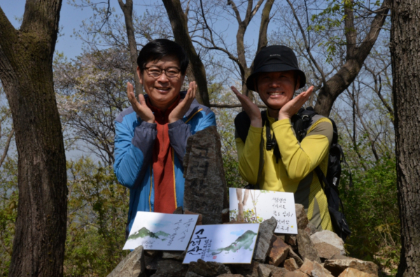 우리 일행은 정상부에 있는 정자에서 잠시 휴식을 취하면서 세종 명산 15곳 완등을 기념해서 종이카드에 의미 있는 글과 그림을 표현한다. 한 달에 한 곳씩 1년여 동안 세종시 산을 오르면서 세종시 15개 산을 소개해 왔다.