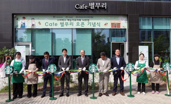 이날 개점식에선 테이프와 케이크를 커팅하면서 카페 별무리 개점을 축하하고 스타벅스 코리아, 더베이크의 재능기부를 통해 구성한 메뉴 중 바리스타가 직접 만든 커피와 소금빵 등을 맛보는 시간을 가졌다.