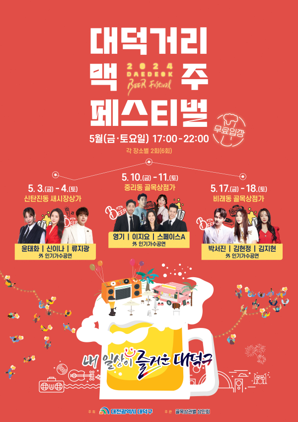 [충청뉴스 박영환 기자] 대전 대덕구(구청장 최충규)가 오는 5월 3일부터 지역 소상공인의 매출 증대와 골목상권 자생력 강화를 위한 ‘2024 대덕거리 맥주페스티벌’을 개최한다고 전했다.