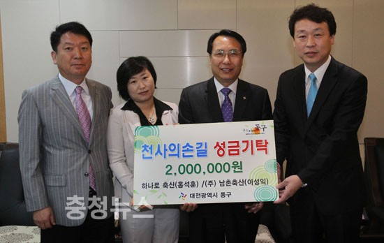 대전 동구 소재 축산가공업체인 하나로축산(대표자 홍석훈)과 ㈜남촌축산(대표자 이성익) 대표자 2인은 22일 한현택 동구청장을 찾아 '천사의 손길 행복+'에 이웃돕기 성금 100만원을 각각 기탁했다.