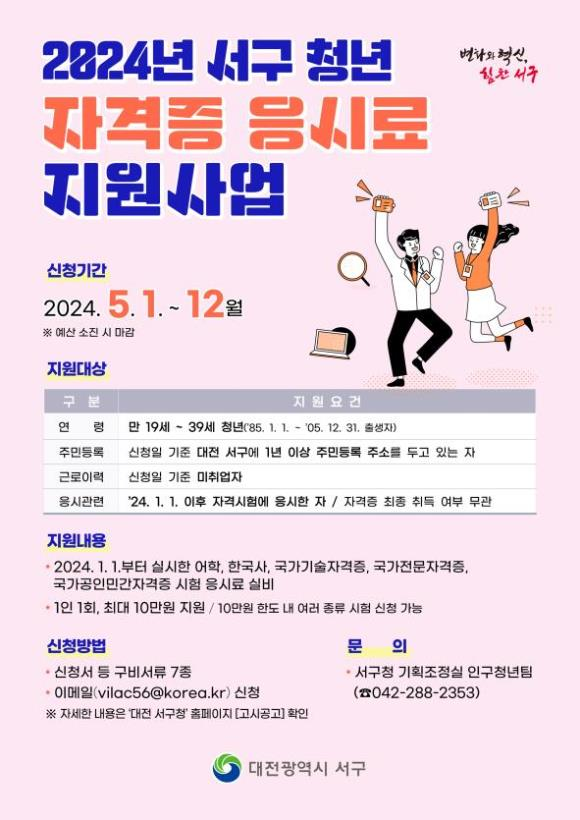 [충청뉴스 박영환 기자] 대전 서구(구청장 서철모)는 청년들의 취·창업 역량 강화에 동기를 부여하고, 경제적 부담을 덜어주기 위해 ‘청년 자격증 응시료 지원사업’을 시행한다고 30일 밝혔다.