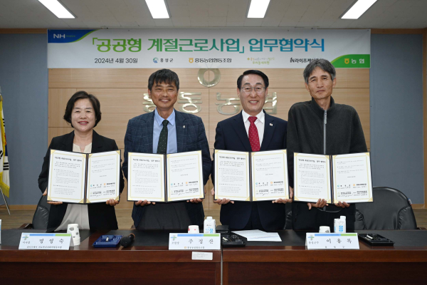 군은 30일 홍동농협에서 이용록 군수와 홍동농협 주정산 조합장, 우리동네의원 금창영 이사장, 라이프케어 명영숙 이사장 등이 참석한 가운데 공공형 계절근로 사업 업무협약(MOU)을 체결했다.