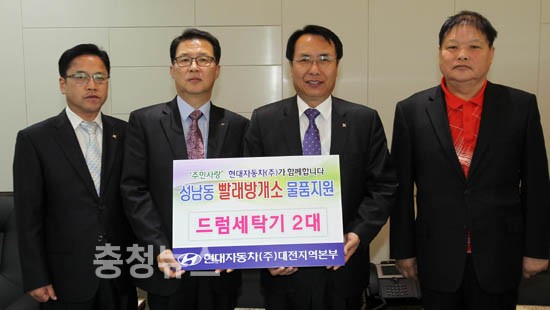 현대자동차 대전지역본부(본부장 이재준)는 24일 한현택 동구청장을 찾아 '성남사랑 빨래터'에 사용해 달라며 드럼세탁기 2대를 기증했다.