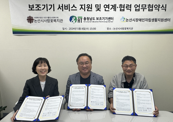 [충청뉴스 박동혁 기자] 충청남도보조기기센터는 8일 논산시사람꽃복지관, 논산시장애인자립생활지원센터와 보조기기 서비스 지원 연계·협력을 위한 업무협약을 체결했다고 밝혔다.