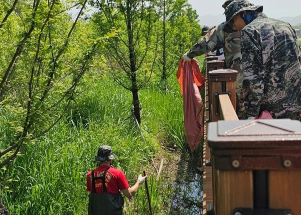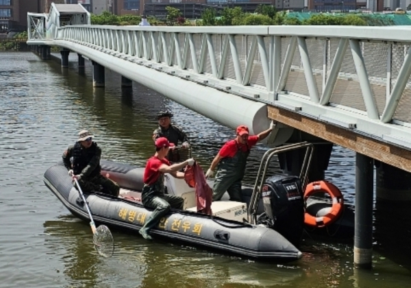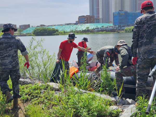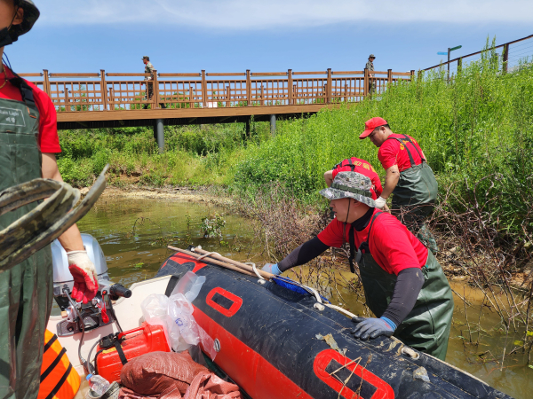 특히 해병대 천안전우회원들은 재난재해용 보트 2대를 가동해 사람들의 손길이 미치지 않는 곳에 고여 있는 오물과 폐사한 물고기 등을 치웠다.