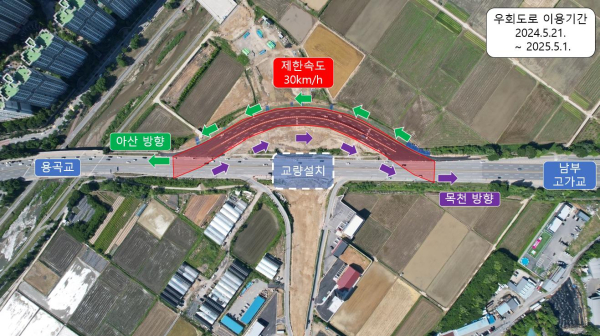 임시우회도로는 용곡교(용곡동 180-8)~남부고가교(용곡동 145-3) 약 500m 구간이다.