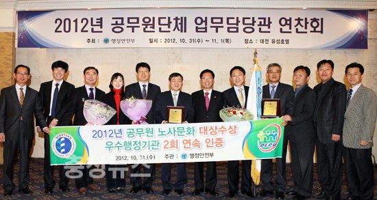 대전광역시교육청(교육감 김신호)과 대전광역시교육청 공무원노동조합(위원장 이재규)은 행정안전부에서 발표한 '2012 공무원 노사문화 우수행정기관 인증 및 노사문화 대상' 선정평가에서 시·도교육청에서는 유일하게 노사문화 대상을 수상하고 우수행정기관으로 2회 연속 선정되었다고 밝혔다.