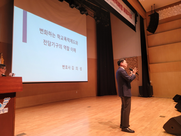 강사로 위촉된 김의성 변호사는 학교폭력전담조사관제도, 학교폭력 사안처리 결과에 따른 대입 변경사항, 학교폭력 관련 신고 및 접수, 사안조사, 긴급조치, 전담기구심의와 학교장 자체해결의 요건, 갈등조정 프로그램 등과 같은 사례위주의 교육을 실시하여 참석자들의 높은 호응을 받았다.
