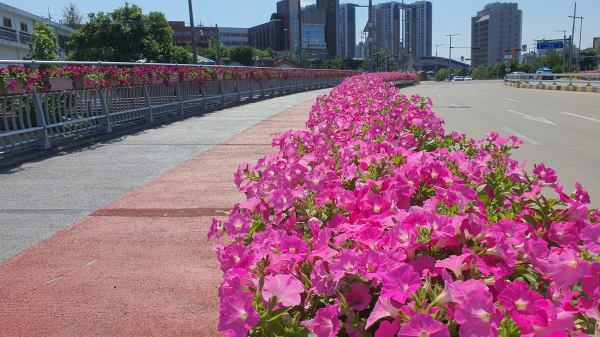 구는 올해 조성 사업에 ▲제2치수교 ▲제1치수교 ▲대신교 ▲새들뫼교 ▲삼가교 등 5개의 교량을 추가했으며, 웨이브 페튜니아 4만여 본을 식재해 총 10개 교량에 걸쳐 분홍빛 꽃물결을 이루는 장관을 연출하게 됐다.