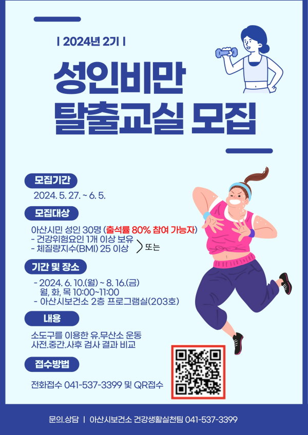 [충청뉴스 박동혁 기자] 충남 아산시는 내달 5일까지 ‘제2기 성인비만 탈출교실’ 프로그램 참가자를 모집한다고 27일 밝혔다.