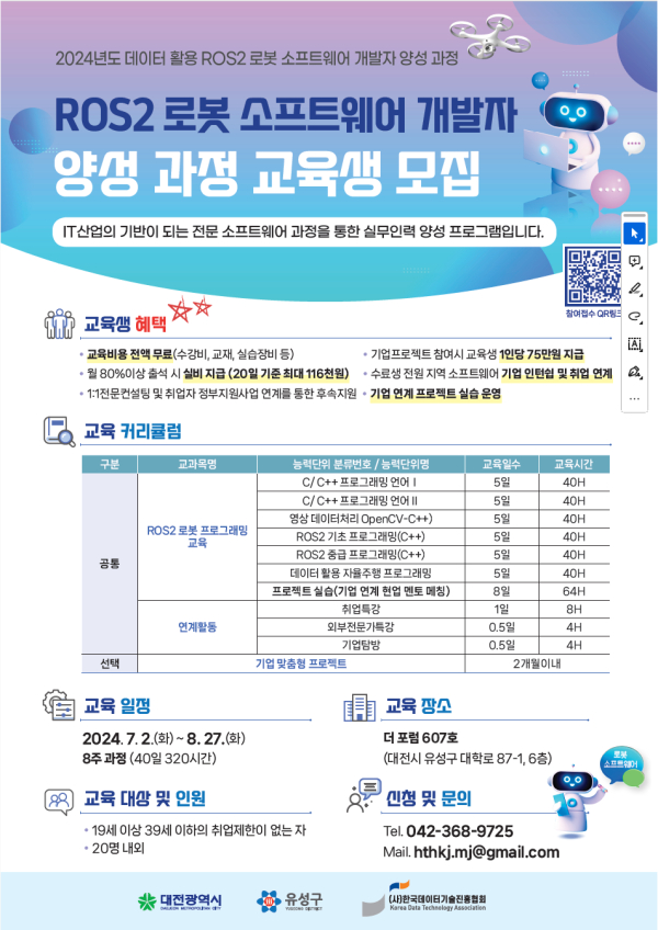 [충청뉴스 박영환 기자] 대전 유성구가 25일까지 ‘데이터 활용 ROS2 로봇 소프트웨어 개발자 양성과정’사업의 참여자를 모집한다고 전했다.