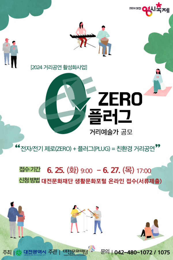 본 사업은 2024년 거리공연 활성화사업의 일환으로 ‘전자/전기 제로(ZERO)’와 ‘플러그(Plug)’단어를 합쳐, 어쿠스틱 악기만으로 공연이 가능한 단체를 선정, 대전‘0시 축제’기간 중 소규모 거리공연을 지원한다.
