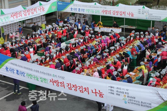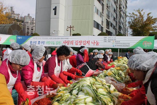 충남농협(본부장 임승한)은 12일 충남지역본부 후정 주차장에서 고향주부모임 충남도지회(도회장 맹은섭)와 농가주부모임 충남연합회(회장 김화중)회원 그리고, 다문화가정 이주여성 등 300여명이 함께 '사랑의 김장담그기' 행사를 가졌다.