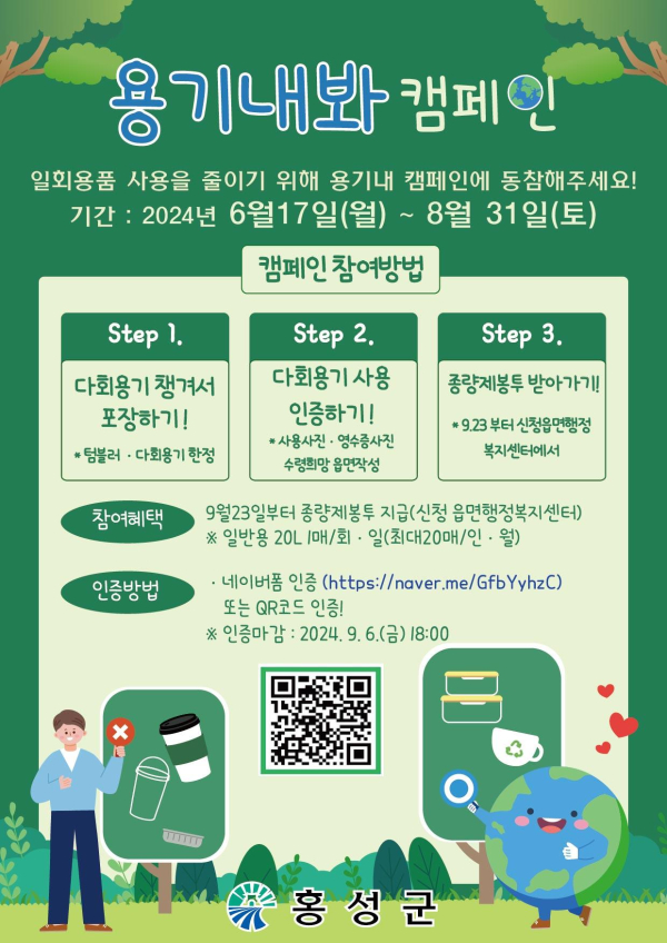 [충청뉴스 권상재 기자] 홍성군이 17일부터 8월 31일까지 ‘용기내봐 캠페인’을 펼쳐 1회용품 사용 절감과 다회용기 활성화에 나선다.