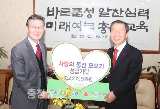 충남교육청(교육감 김종성)은 16일 오전 교육감 접견실에서 그동안 저소득층가정 학생 돕기 일환으로 추진한 ‘2012 사랑나눔 동전모으기’ 성금 3억2224만원을 충청남도사회복지공동모금회(회장 신한철)에 기탁했다.