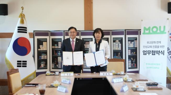 [충청뉴스 논산 = 조홍기 기자] 한국유교문화진흥원(이하 한유진, 원장 정재근)과 논산여자고등학교(이하 논산여고, 교장 원윤숙)은 지난 18일, 한유진 청연실에서 유교문화 연계 인성교육 진흥을 위한 업무협약을 체결했다.