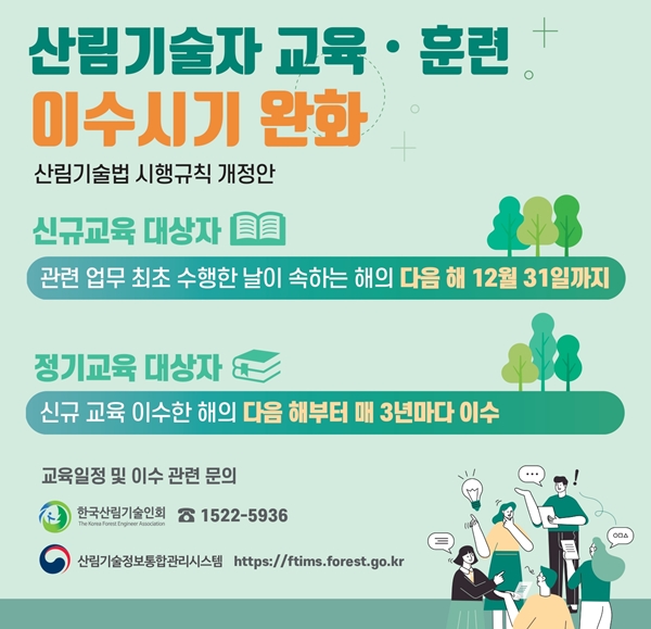 이는 산림기술자의 교육·훈련 이수 시기 완화 및 행정절차 간소화를 위해 제도 운영상 나타난 일부 미비점을 개선·보완한 것이 개정된 법률의 골자다.