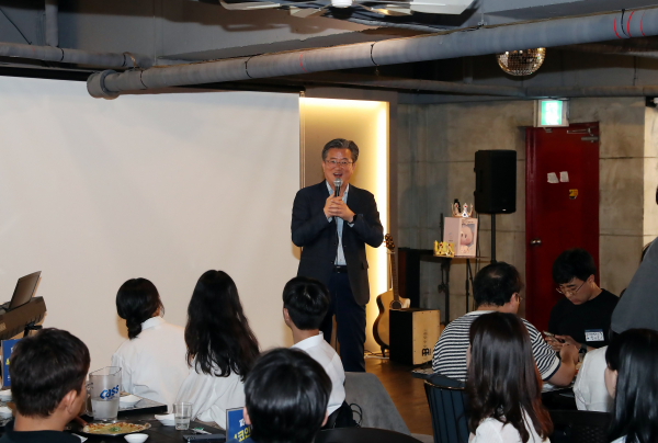 지난 27일 궁동 일원에서 열린 어은궁동 스타트업×로컬 네트워킹 파티에서 정용래 유성구청장이 참석자들에게 인사말을 전하고 있다.
