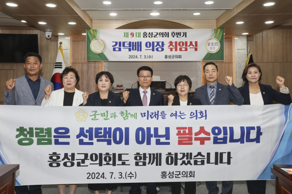 [충청뉴스 권상재 기자] 제9대 홍성군의회는 지난 1~2일간 진행된 제305회 임시회에서 김덕배 의장, 김은미 부의장, 신동규 의회운영위원장, 윤일순 행정복지위원장, 최선경 산업건설위원장을 선출하고 3일 홍성군의회 본회의장에서 김덕배 의장의 취임식을 가졌다.