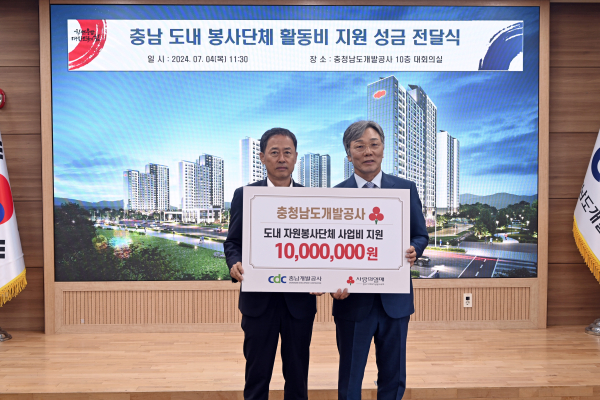[충청뉴스 권상재 기자] 충청남도개발공사(이하 공사)는 4일 도내 복지사각지대 해소에 앞장서고 있는 봉사단체 지원을 위해 충남사회복지공동모금회에 1천만 원을 기탁했다고 밝혔다.