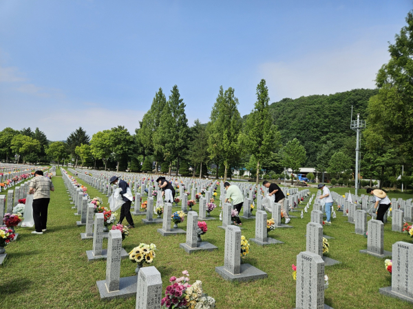 [충청뉴스 박영환 기자] 대전문화재단(대표이사 백춘희)은 순국선열과 호국영령의 숭고한 희생을 기리기 위해 4일 국립대전현충원을 찾아 묘역정비 등 환경정화 봉사활동을 펼쳤다고 전했다.