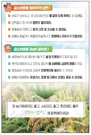 질소비료를 과다 시비하면 비료가 낭비되는 것은 물론 과잉생산으로 쌀값이 하락해 농가의 소득도 줄어들게 된다.