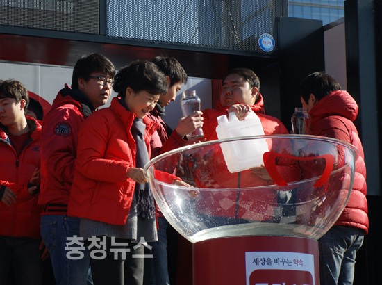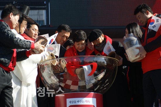 박근혜 후보는 연설에 앞서 국민대통합과 100% 대한민국건설을 위해 전국 17개시도에서 모은 물과 흙을 섞는 합수·합토식을 거행해 눈길을 끌었다. 특히 대전시민들은 변승일 농아인협회장이 박근혜 후보 지지를 호소하는 수화연설에 큰 박수를 보내며 격려했다.