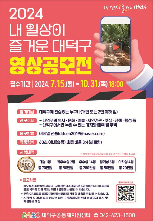 [충청뉴스 박영환 기자] 대전 대덕구가 주민들을 대상으로 대덕구 슬로건 ‘내 일상이 즐거운 대덕구’를 주제로 영상 공모전을 개최한다고 밝혔다.